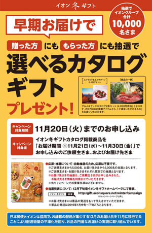 取り組みでは、冬ギフトの配達期間を11月21日-30日に指定した顧客と同期間で冬ギフトを受け取った顧客に抽選で「選べるカタログギフト」(4000円相当)がそれぞれ抽選で当たるキャンペーンを行う。20日までの申込みが対象で、当選本数は、依頼主・届け先それぞれ5000本。当選発表はイオンの冬ギフトのホームページで12月下旬頃発表する。