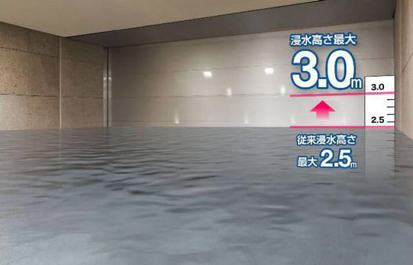 今回、防水シャッターの最大浸水高さを2.5メートルから3メートルに引き上げる仕様追加を行った。これにより、浸水する危険性がより高い場所への設置も可能となり、想定される浸水被害エリアへの対応をさらに範囲を広げてカバーできるようになった。