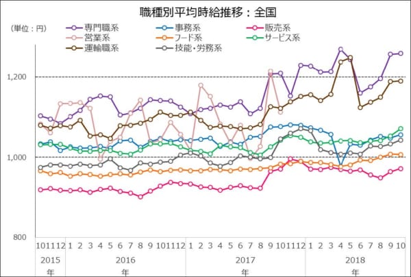 なお、すべての職種の全国平均時給は1046円で1.1%増加だった。
