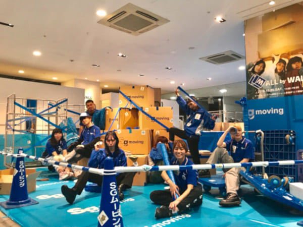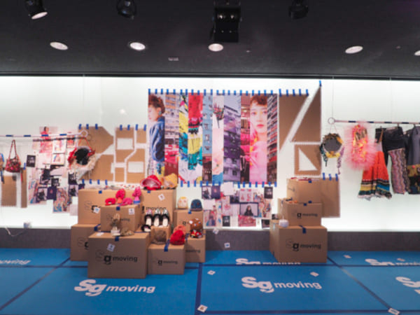 ダンボールや台車、養生シートやコンテナなど、SGムービングが引越し業務で使用している本物の資材を使用して、各ブランドのデザイナーが商品ディスプレイ用のブースを作成したほか、イベント当日は「WALL」の店舗スタッフが、SGムービングの制服を着用して接客を行った。