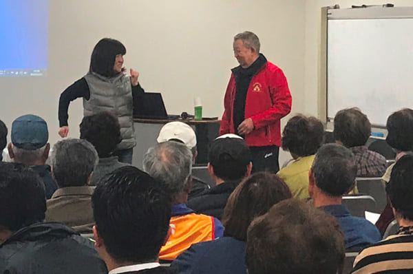 講師には、ハートヴィッヒ・ガウダーパワーウォーキングクラブ日本本部理事長の古賀和仁氏とパワーウォーキングインストラクターの大島和子氏を招き、健康増進に関わる講義と屋外での実技講習の2部構成でそれぞれ1時間行った。