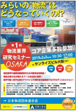日本物流団体連合会(物流連)は21日、関西で初開催となる「第1回物流業界研究セミナー大阪」を、来年2月3日にサンライズビル大阪(大阪市中央区)で開催すると発表した。