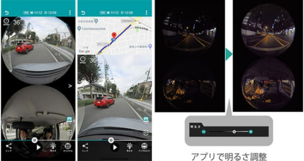 加えて、従来の360度映像は画素数が多く、画像サイズを圧縮するため小さくリサイズする必要があるが、そのため記録された一部分を拡大すると画像が粗くなっていた。しかし同製品では「デュアルレック機能」により、フロント部分(1920×1080)をリサイズせずに切り出し、全天球のリサイズ映像と合わせて記録する。これにより360度録画と高解像度のフロント録画の両立を実現した。