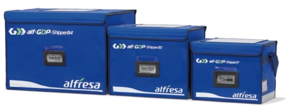 alf-GDP-Shipperは、主に保冷品を医療機関へ配送する際に使用する専用保冷箱で、輸配送の時間や物量に合わせて最適な大きさを選択することが可能。多くの保冷管理の必要な医薬品の保管温度である2-8度を8時間以上維持することができる。