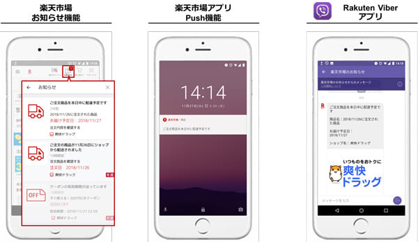 楽天市場で対象商品を購入したユーザーに対して、商品の配送状況を、楽天市場トップから参照できる「お知らせ」機能、「楽天市場アプリ」のプッシュ通知、楽天グループの無料通話・メッセージングアプリ「Rakuten Viber」でのメッセージやプッシュ通知で通知する。