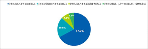 調査では、「1年前に比べて人手不足を感じるか」について過半数を超える67.2%が「1年前よりも人手不足が悪化」と回答。引き続き多くの企業が人手不足で悩んでいる状況となっている。業種別で見ると「医療・福祉関連業」(75.9%)が最も高く、「人材サービス業」「運輸業」の業種が7割を超える回答となった。