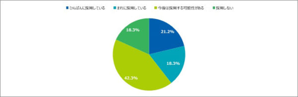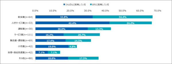 「外国人(留学生など)を新規採用しているか」については「ひんぱんに採用している」が21.2%、「まれに採用している」が18.3%と、合わせて39.5%の企業が「外国人を新規採用している」と回答。業種別で見ると「飲食業」(67.2%)「人材サービス業」(66.6%)が過半数を超えた。