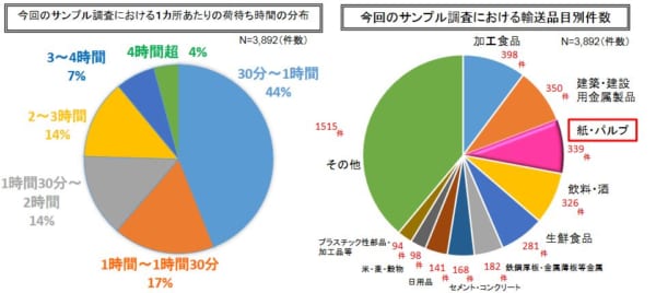 7月に行った調査は、荷待ち時間の削減に向けた取り組みに活用することを目的として、昨年7月から義務付けた荷待ち時間などの記録を基に、「荷主の都合で30分以上の荷待ちが発生したもの」を対象にサンプル調査・分析を実施したもの。全日本トラック協会を通して5000者へ調査票を配布し、300者から3892件の回答を得た。その結果、最も多かった輸送品目は加工食品で398件となり、今回検討する紙・パルプは339件で3番目に多かった。