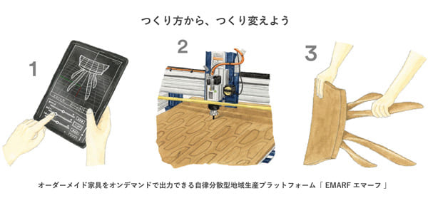 これまではバリューチェーンの川上に位置する製材所・材木屋・工務店など全国30か所にデジタル木工機器「Shopbot」(ショップボット)を提供してきたが、EMARFとShopbotを連動させることで、地域の材料を用いてユーザーに「最短距離・最短時間」でオリジナル製品を届ける体制が整った。