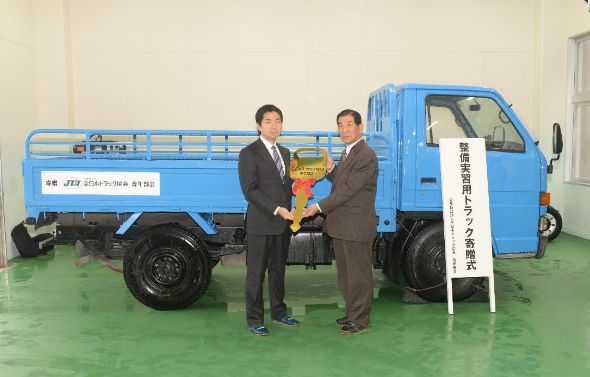 整備実習用トラックの寄贈は、2015年度から青年部会の社会貢献活動の一環として行っているものでこれまでに7校へ寄贈した。今年度は自動車教育課程を有する高等学校で組織されている全国自動車教育研究会(全自研)を通じて希望のあった同校の自動車整備科と、愛知県立小牧工業高等学校の自動車科のに青年部会各ブロック大会会場などで集めた募金を原資に中古トラックを購入し、寄贈を行う。