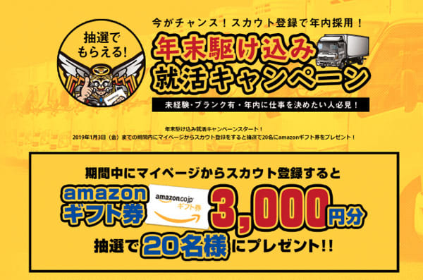 キャンペーンは、2019年1月3日までの期間中、マイページから「スカウト登録」をした求職者の中から抽選で20人に、アマゾンギフト券3000円分をプレゼントするもの。