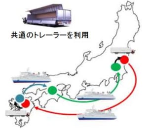 関東・四国・九州間を結ぶ日用品、食料品や空パレット輸送について、出荷量や出荷日の調整、トレーラーの固定的な運用などを通じ、実車率99.5%とほぼ全区間での実車輸送を伴う形で、異業種3社による往復での海運モーダルシフトを実施し、環境負荷の低減や省労働力化などを実現した。