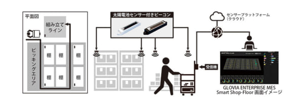 実験では、(1)ピッキングエリアと組み立てライン計20か所へ太陽電池センサー付きビーコンを設置するほか、ピッキング台車に受信機を設置(2)作業員がピッキング台車を使用してピッキングしている場所をビーコンの位置情報をもとに検知(3)位置情報データをセンサープラットフォーム(クラウド)で集約(4)グロービアエンタープライズMESスマートショップフロアでピッキング台車の位置情報を可視化、動線情報を分析し、ピッキングの効率化――を行う。