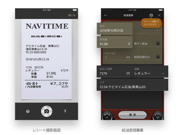新機能は、ガソリンスタンドで給油した際のレシートをスマートフォンで撮影するだけで、金額だけでなく、日付、給油場所、給油量、油種をカーナビタイムの給油登録画面に自動で入力できるもの。国内「ほぼ全て」のガソリンスタンド、油種に対応し、レシートを読み取った直後からデータの保存や編集が可能となる。