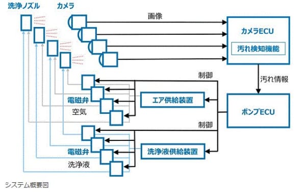 独自の「カメラ別汚れ検知技術」とエア供給装置・洗浄液供給装置・電磁弁の「洗浄制御技術」を組み合わせたもので、カメラごとの汚れを検知し、その結果に応じてポンプECUでエア供給装置・洗浄液供給装置・電磁弁を制御、カメラごとに最適な洗浄モードを実行する。