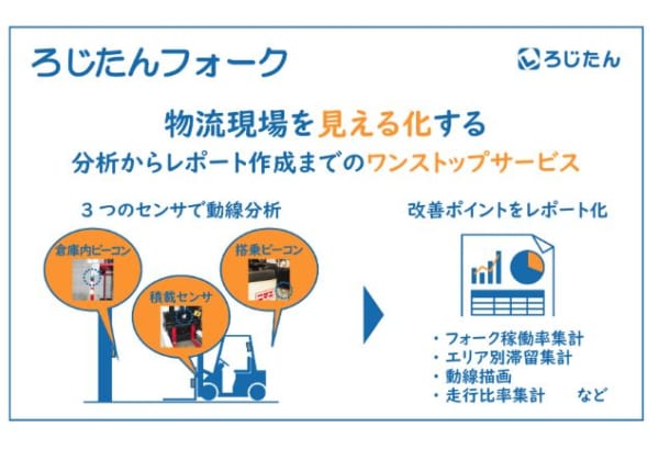 同展示会の「IoT×屋内測位パビリオン」にブースを構え、倉庫・工場内のフォークリフトの稼働状況を可視化し、適正な台数を算出するサービス「ろじたんフォーク」を展示する。