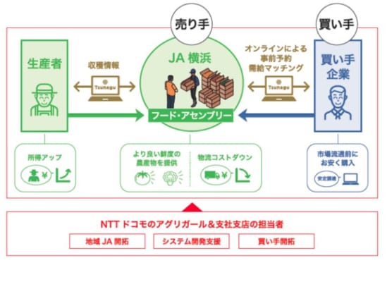 産業・一般NTTドコモは21日、神奈川県でJA横浜、農作物取引プラットフォームを運営するTsunagu(ツナグ、東京都千代田区)と共同で、生産者と買い手をつなぐ実証プロジェクト「地元を食べよう」を行い、「新たな食農流通、新たな物流の形を目指す」と発表した。