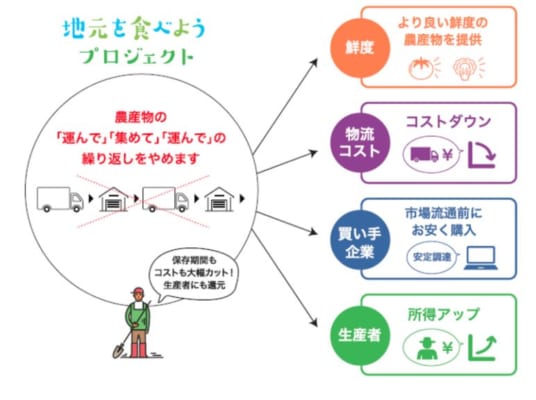 プロジェクトは、売り手となるJA・生産者と、買い手となる食品加工、飲食店、ホテル、食堂などの企業が直接売買できる農作物取引プラットフォームを活用し、あらかじめ指定した場所で作物の受け渡し・受け取りを行う「フード・アセンブリー方式」を採用して実施するもので、物流にかかる時間やコストを削減し、新鮮な作物を提供できる「地産地消」を掲げる。