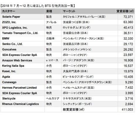 18年上半期(1?6月)と合わせた年間データでは、竣工施設35棟、総賃貸面積115万平方メートル、総投資額10億米ドル(1100億円))となった。
