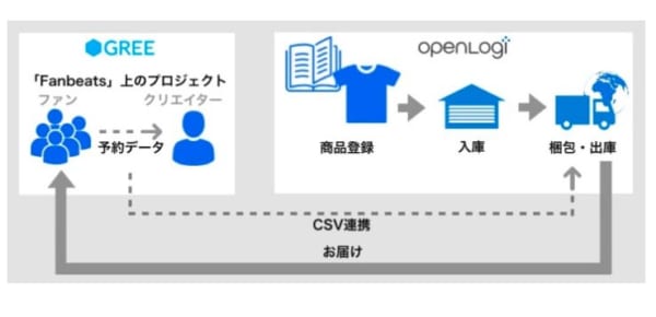 クリエイターのファン向け商品の在庫管理や出荷作業などの物流業務を代行するもので、クリエイターは、ファンビーツ上で商品の予約データをダウンロード後、オープンロジにアップロードするだけで「世界中のファン」に向けて商品を発送できるようになる。