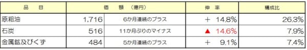 輸出は5か月ぶりのマイナスとなる7614億円(5.2%減)、輸入は9か月連続のプラスとなる6521億円(0.5%増)となった。主要品目の動向は次の通り。