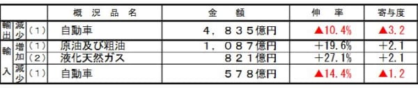 輸出は23か月ぶりのマイナスとなる 1兆7081億円(2.3%減)、輸入は9か月連続のプラスとなる8996億円(8.1%増)だった。主な増減品目は次の通り。
