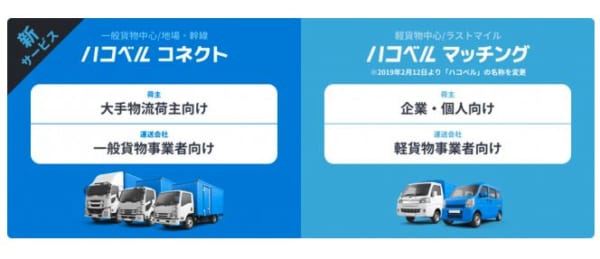 これに伴い、従来のハコベルは、軽トラックやカーゴなどを扱う軽貨物事業者と荷主のマッチングに特化し、名称を「ハコベルマッチング」に変更する。