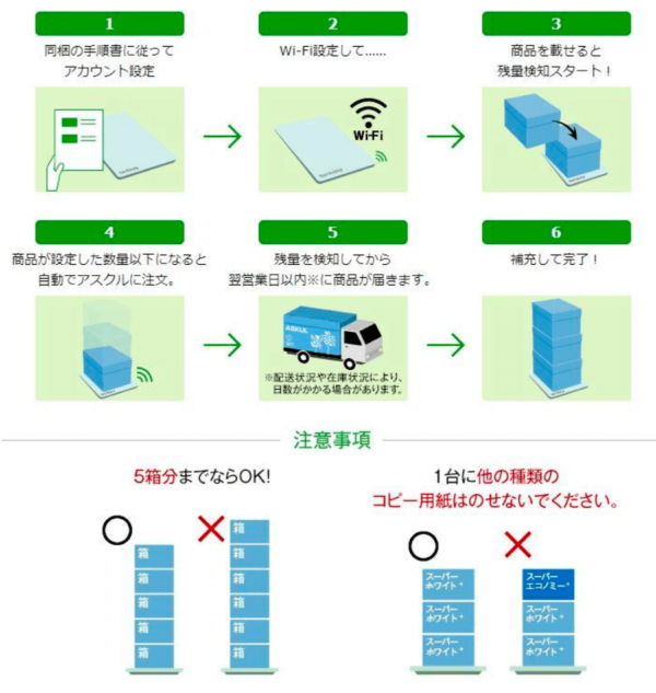 ECアスクルは28日、コピー用紙の残量をIoT機器「スマートマット」で検知し、自動で発注・配送する「コピー用紙自動配送サービス」を2月下旬に開始する、と発表した。