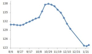 | 地域 | 1月21日(単位:円) | 1月28日(単位:円) | 増減値(単位:円) |
