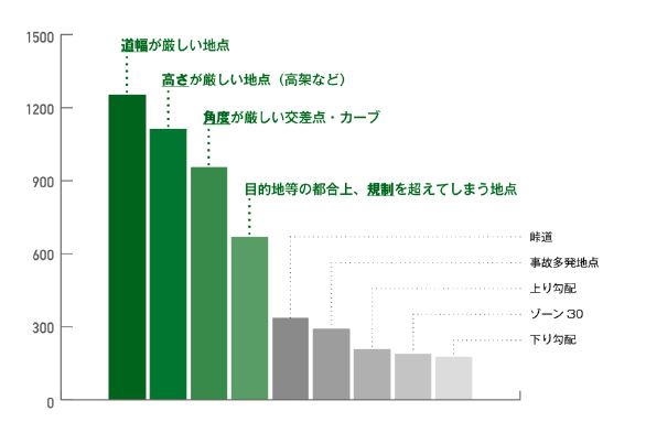 なかでも「道幅が厳しい地点」「高架など高さが厳しい地点」「角度が厳しい交差点・カーブ」「目的地などの都合上、規制を超えてしまう地点」といった、走行する上で注意すべき情報を事前に把握しておきたいドライバーが多く、アプリ利用者の8割が中長距離ドライバーだったことから、「土地勘のない場所へ行く業種に需要があるのではないか」と考え、新機能を開発した。