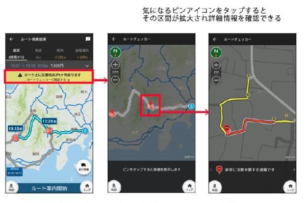 新機能の「ルートチェッカー」では、利用者が各自登録した車両情報に対し「通行はできるが注意が必要な箇所とポイント」をひと目で確認できる。ルート検索後、ルート上に注意箇所がある場合、注意文言と度合いで色分けしたピンアイコンを地図上に表示。