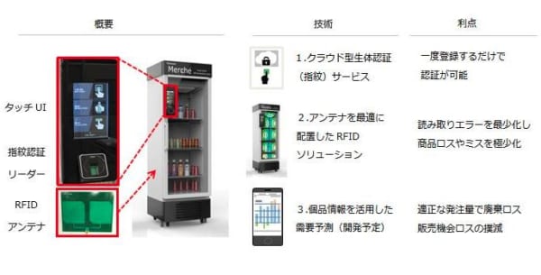 あらかじめ登録した顧客の生体情報(指紋)をクラウドで認証し、安全で利便性の高い「手ぶら決済」を実現したほか、棚中商品の在庫モニター、欠品検知、賞味期限検知といった機能を搭載。冷蔵ショーケースなど既設の什器に応じた電波伝搬解析により、RFIDアンテナを最適に配置し、高い読み取り率でコストを抑えたRFIDシェルフを実現する。