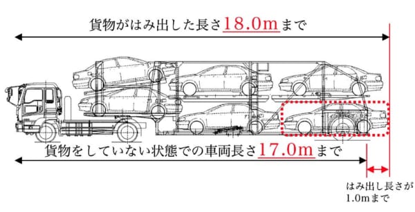 同制度では現在、海上コンテナセミトレーラの連結全長として最大18メートルまで認めているが、陸送車はその対象外となっており、積載効率を高めて人手不足の改善につなげる観点から、陸送トレーラも「貨物がはみ出した長さ」を含めて18メートルまで認める方向で審議を重ねている。
