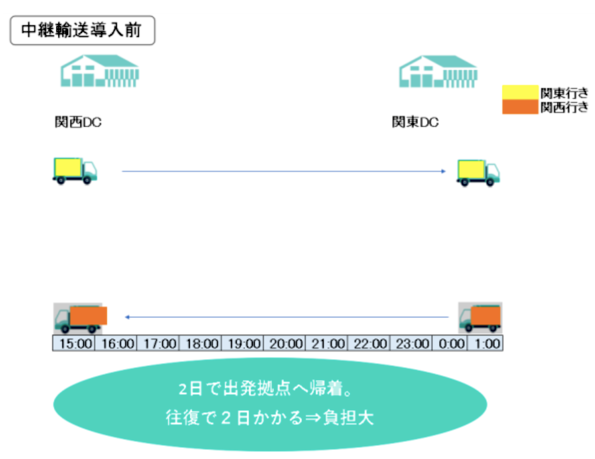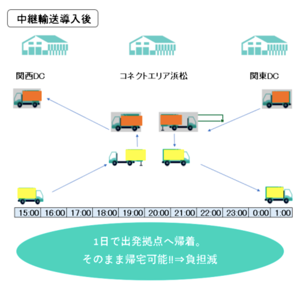 これまでの、関東から関西、関西から関東への輸送形態では、出発したトラックが帰着するまでに2日間を要し、その分、ドライバーにも負荷がかかっていたが、スワップボディコンテナ方式の中継輸送を導入することで、負荷の軽減を図る。