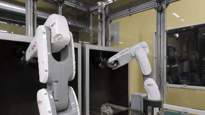 同ロボットは、多関節ロボット2機で構成するロボットアームとドライアイスを使用し、自動でクリーニング作業を行うことができるもので、ドライアイスの粒子を圧縮空気で噴射させ、短時間で機器の汚れを除去する。氷点下79度のドライアイスを用いることにより、付着物の表面温度が急激に低下し、熱収縮によって付着物と機器本体との間に隙間が発生、その隙間にドライアイスの粒子が入り込み、750倍の体積膨張によって付着物を剥離する仕組み。