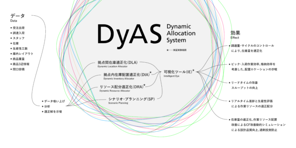 特許対象となるアルゴリズムは、物流施設内の大量の商品を効率的に入庫、出庫、荷合わせ、輸配送し、施設内の商品の配置最適化を計算する情報処理プログラムに必要な「拠点間在庫最適化」「拠点内在庫配置最適化」「リソース配分最適化」「シナリオプランニング」の4モジュールと可視化ツールで構成。