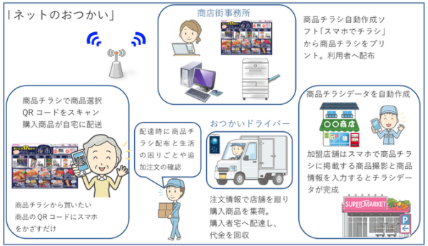 通常の買い物が困難な利用者がスマートフォン上で注文商品を選択・購入すると、販売事業者・運営事務局側は注文データに基づき集荷用の商品を準備。「おつかいドライバー」が商品を配達し、利用者は受け取り時に現金か口座引き落としで代金を決済する。この際、利用者はおつかいドライバーに生活相談や追加の注文を依頼できる仕組み。