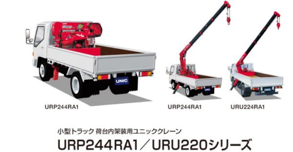 小型トラックの荷台内架装用ユニッククレーンは、車両総重量5-8トンの小型トラックの荷台内に架装される「コンパクトクレーン」で、走行(格納)時はクレーンのブームが車両上部に突出することなく、車両全高内に収まる。小型トラックの小回り性を損なうことなく、住宅が密集した市街地などの狭小地でもスムーズに移動できるため、造園業や石材業などを中心に幅広い業種で使用されている。