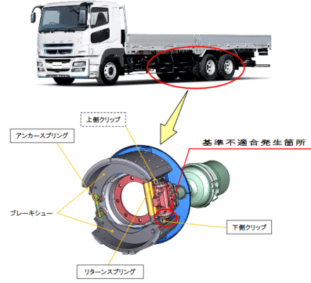 エアサスペンションを装着した大型トラック・バスにおいて、リヤブレーキシューを固定しているスプリングの設定が不適切なため走行時の振動入力によって当該シューが振動してクリップ(シュークリアランスを調整するアジャスターを保持している部品)を叩き、クリップが変形又は破損することがある。