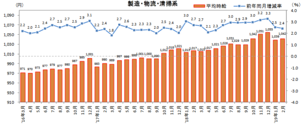 産業・一般リクルートジョブズ(東京都中央区)は14日、調査研究機関「ジョブズリサーチセンター」がまとめた2月のアルバイト・パート募集時平均時給調査の結果を発表した。「製造・物流・清掃系」の平均時給は三大都市圏で1042円となり、前年同月比で2.4%増加した。