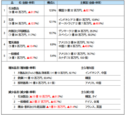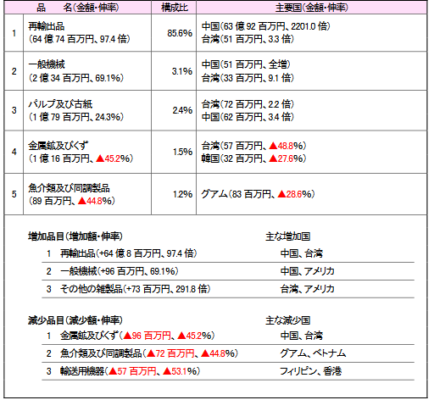輸出が2か月ぶりの大幅なプラスとなる75億6700万円(6.3倍増)、輸入は3か月連続のマイナスとなる74億1200万円(24.1%減)だった。主要品目別の動向は次の通り。