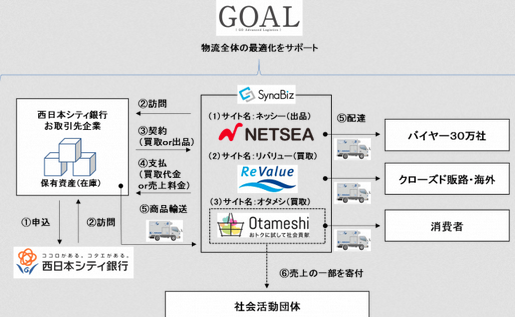 西日本シティ銀行がBtoB向け卸売・仕入れプラットフォームサービス「NET SEA」(ネットシー)や返品商品・在庫の流動化サービス「ReValue」(リバリュー)、「Otameshi」(おためし)などの紹介を希望する取引先と、佐川急便、SynaBizとの商談機会を設け、購入代金の一部は社会貢献活動団体に寄付する仕組みも用意する。