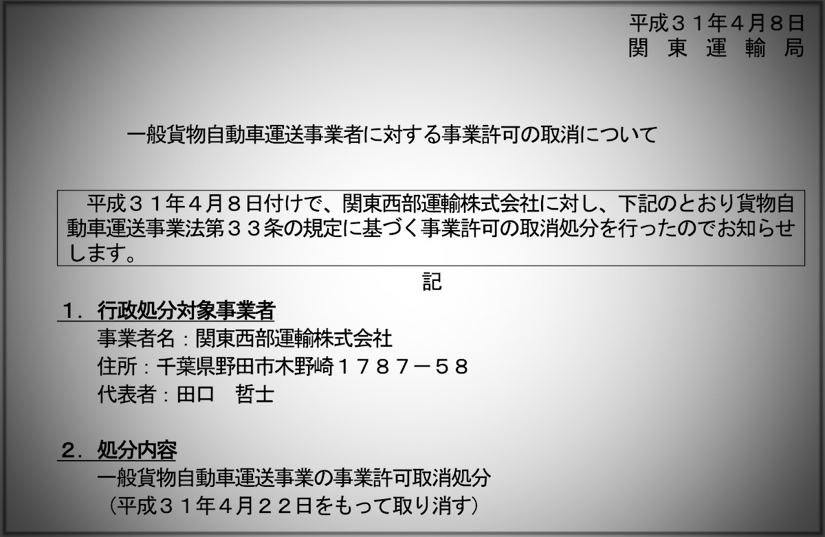 行政・団体関東運輸局は8日14時、関東西部運輸(千葉県野田市)に対し、4月22日付で貨物自動車運送事業の許可を取り消すと発表した。
