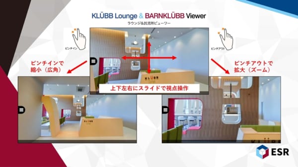 機能の一つ「ジャイロモード」は、気軽に視点を変えながら360度、ESRのラウンジ・託児所をバーチャル体験できるもので、クリップオンの簡易VR眼鏡でVR表示にも対応している。現時点ではラウンジ・託児所のある市川、久喜、南港1、南港2、藤井寺、弥富の同社6施設で導入を済ませ、今後竣工する施設へも導入を拡大する方針。