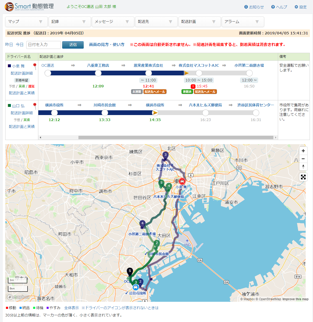 スマートフォンとブラウザを利用することから、専用の機器やソフトを導入する必要はなく、配送計画も「スマート動態管理」内で作成。追加された配送状況進捗機能のほか、運転日報作成機能、メッセージ機能、配送先管理機能、アラーム機能などを利用できる。
