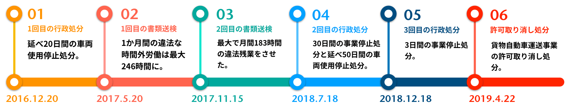 東西の長距離路線を結ぶ幹線輸送を「同社と同等の条件」で引き受けられる会社がほとんどなかったのだろう。こうした見方を裏付けるように、今度は半年よりも少し長い18年7月18日、30日間にも及ぶ「事業停止処分」と延べ50日間の車両使用停止処分を受け、さらに5か月後(半年に少し満たない)の12月18日にには、2回目の事業停止を命じられる。足掛け2年半に及んだ同社に対する当局の処分は回を重ねるごとに厳しさを増しながら、ついに19年4月22日、事業許可を取り消されることになったのである。