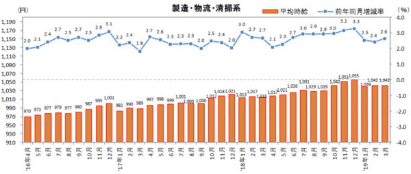 調査・データリクルートジョブズ(東京都中央区)は11日、調査研究機関「ジョブズリサーチセンター」がまとめた3月のアルバイト・パート募集時平均時給調査の結果を発表した。「製造・物流・清掃系」の平均時給は三大都市圏で1042円となり、前年同月比と同水準だった。