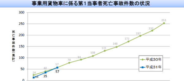 大型トラックが12件(1件減)、中型が6件(5件増)、準中型3件(同水準)、普通1件(1件増)となった。なお、1月から3月までの累計死亡事故件数は57件で、前年同期に比べて同水準であった。