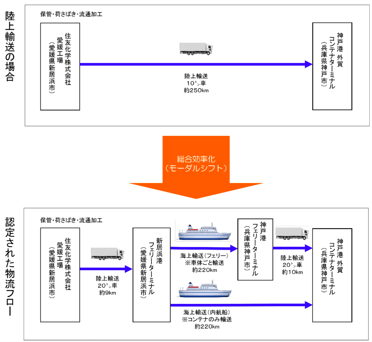 物効法に認定された今回の計画は、増産するメチオニンの神戸港への輸送の大部分を海上輸送することに伴うもので、神戸港まで陸上のみで輸送する場合と比べ、CO2排出量は55%少なくなる。また、トラックによる輸送量は94%削減することとなり、これに従ってトラックドライバーの労働時間は91%減少する。