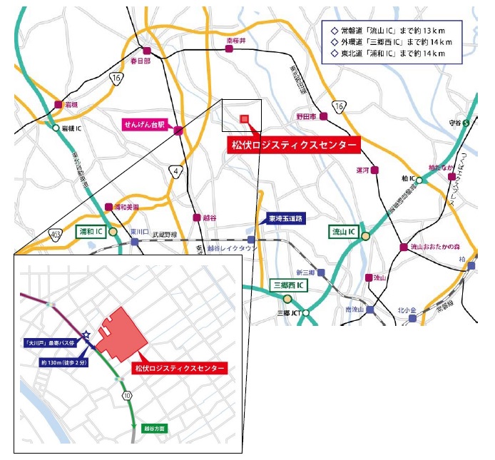 建物は延床面積2万3405坪で、最小2500坪から、最大8テナントの入居が可能。東京都心から30キロ圏内で、東京外かく環状道路(外環道)、国道16号へ接続しやすい立地。建物1階と3階の中央部に車路とトラックバースを設け、非常用発電機を設置するなどの事業継続計画(BCP)に対応しているほか、環境に配慮し省電力LED照明を採用する。